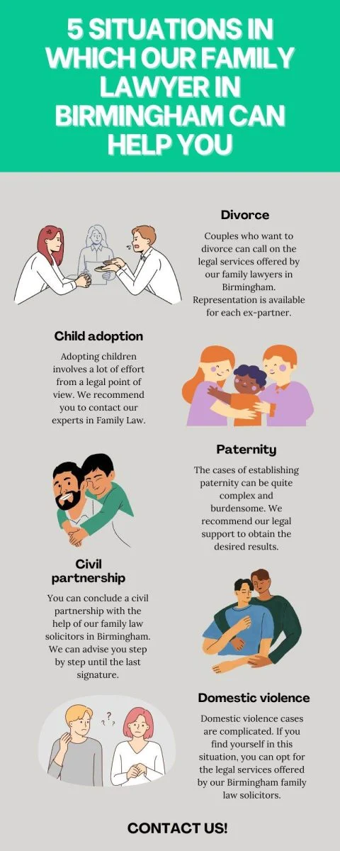 Our family solicitors in Birmingham can suggest the amicable method for getting a divorce, in order to benefit from a simple separation process. However, we can represent you in the court of law throughout the entire procedure if the couple cannot settle an agreement. Here is an infographic about the situations in which you can be helped and represented by our family solicitors in Birmingham: