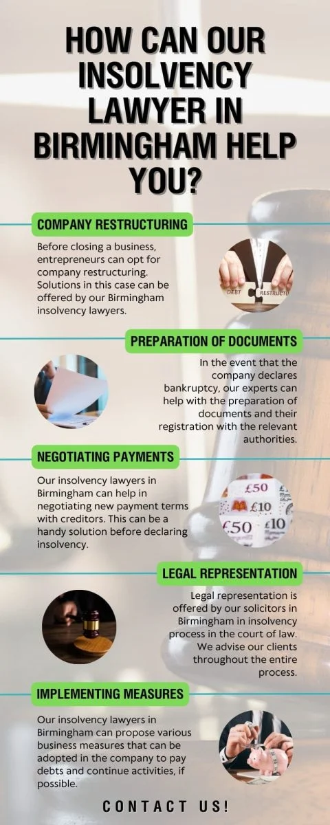 - The legal advice of our insolvency solicitors in Birmingham is required for company owners who deal with financial problems. Our team can discuss the optimal solutions that can be implemented in your firm.